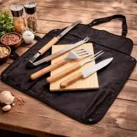 Descrição: Kit Para Churrasco Composto Por Seis Peças: Avental Em Oxford Com Fechamento Em Engate Plástico, Que Pode Ser Dobrado E Utilizado Como Estojo, Com Alças De Mão E Bolsos Multiuso; Tábua Em Madeira De Pinho; E Quatro Utensílios Em Inox Com Cabos Em Madeira, Incluindo Garfo De Duas Pontas, Espátula, Pegador E Faca Com Lâmina De 8 Polegadas.